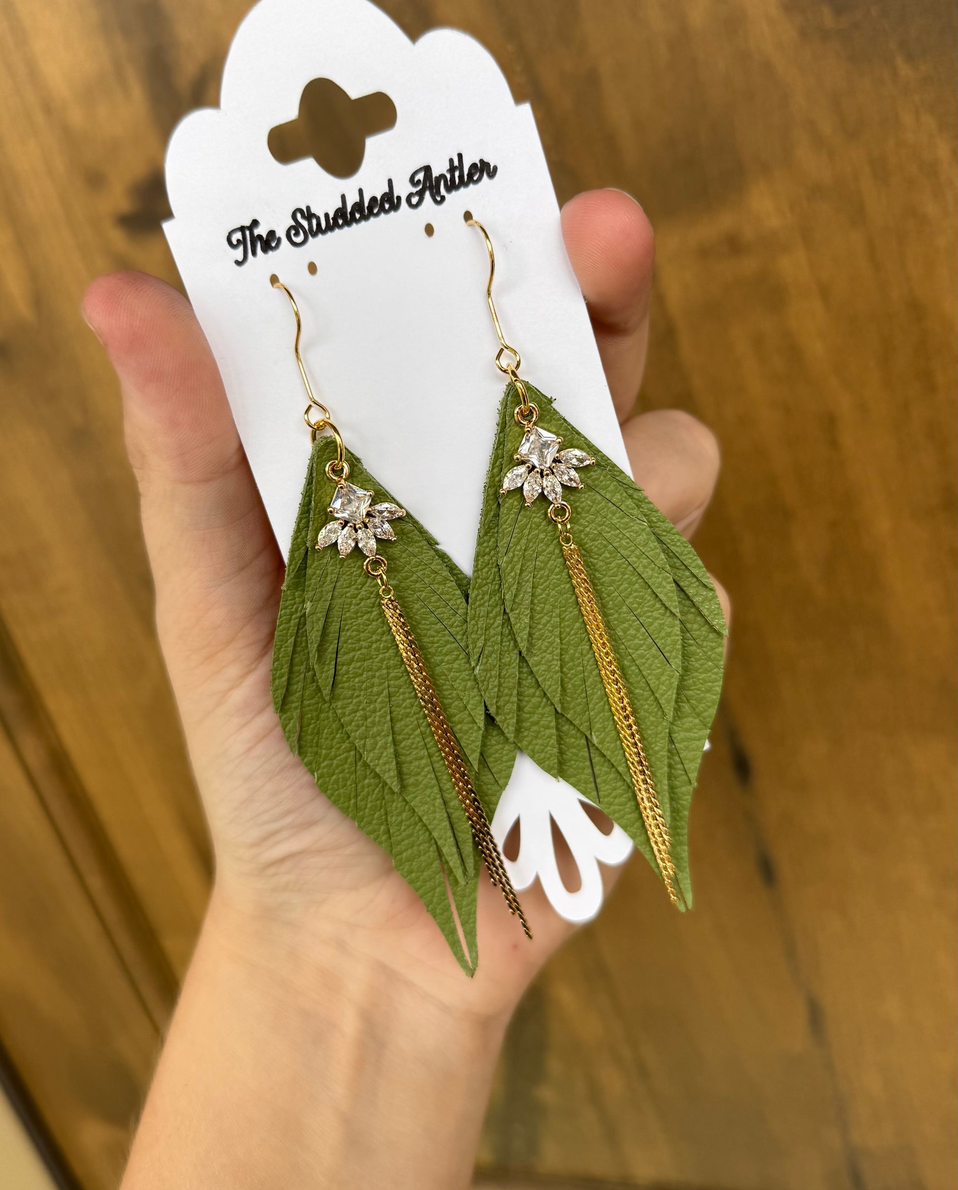 Light olive green leather earrings - Handmade Hypoallergenic Leather Earrings with gold rhinestone tassels