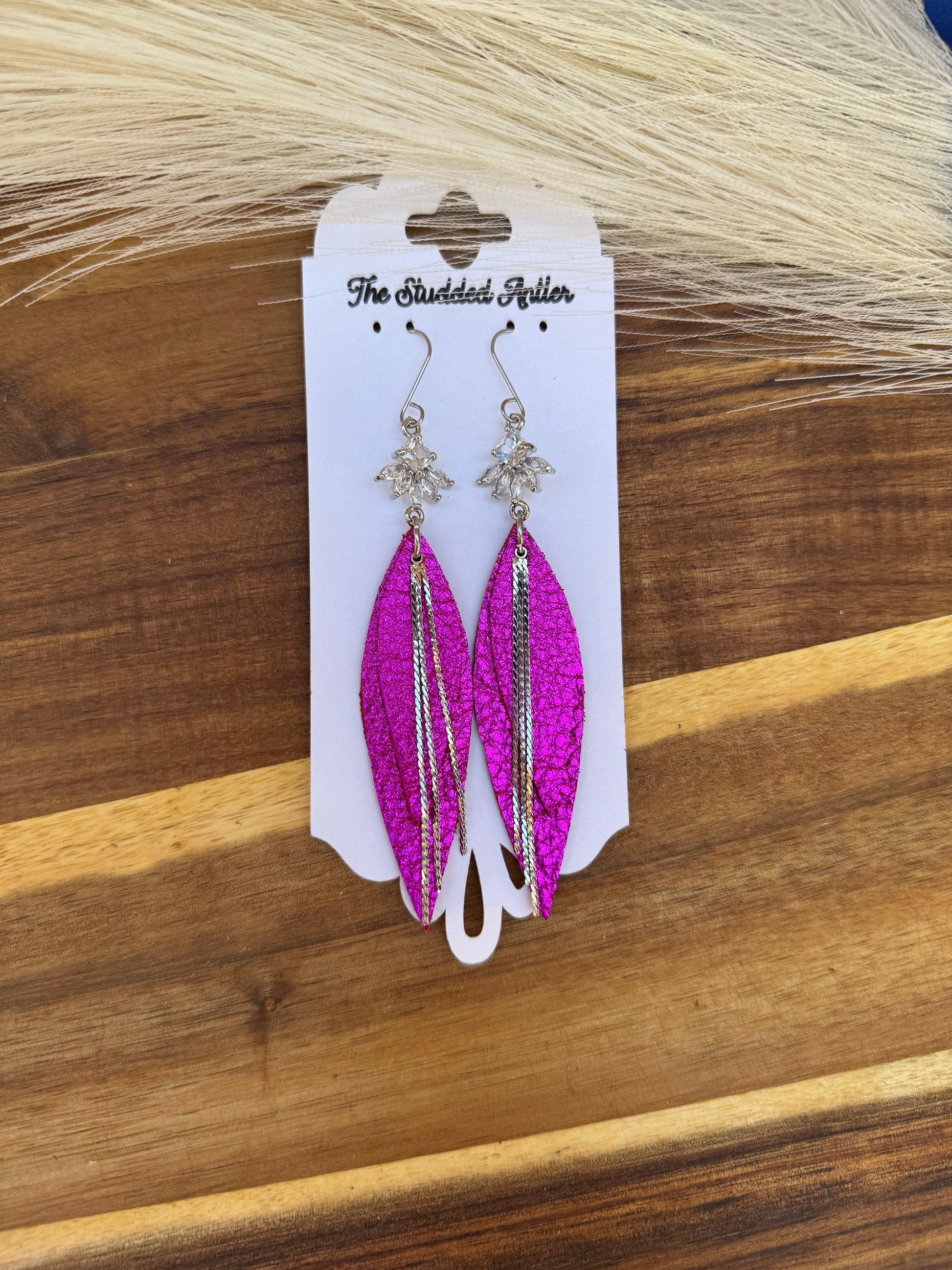 Hot Pink Metallic with rhinestone silver bars Handmade Hypoallergenic Leather Earrings